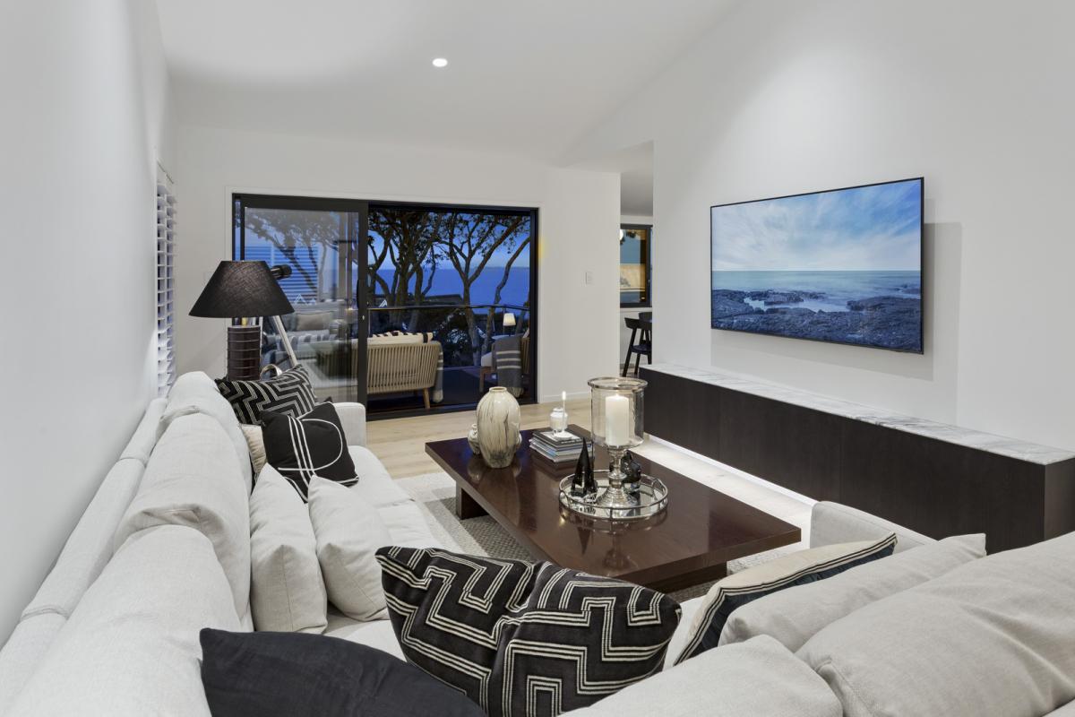 Inside, the upper level is anchored by a designer kitchen, impeccably fitted with Miele appliances, stone benchtops and splashbacks, and a full second kitchen /butlers pantry for effortless entertaining. Enjoy stunning sea views from your casual seating area while the dining space acts as the central hub between kitchen and living. A separate media room/second lounge offers a cozy retreat, opening to a LouvreTec-covered rear deck that soaks in the afternoon sun while offering protection from the wind. This level also includes a fitted laundry, guest powder room, and a study nook.