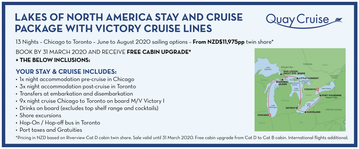 One of the least known cruise destinations, the Great Lakes region, is among our favorite at Quay Cruise. With Air New Zealand direct flights Auckland to Chicago, it’s an easy and convenient way to explore the American and Canadian landmarks bordering the Great Lakes – such a great alternative to a coach tour.