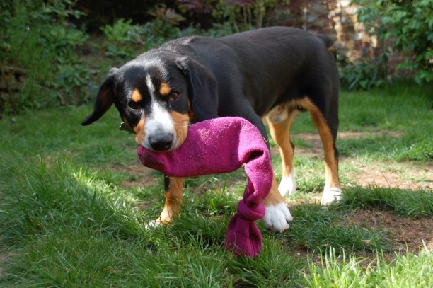 Another variation of the sock toy is to put an empty water bottle in side, makes a great fun crunchy noise. Just make sure you remove the lid and plastic lid ring.