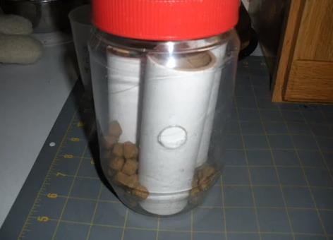 You can make your own treat jar easily. Simply get yourself a plastic jar with a plastic screw on lid. Something big enough to fit a couple of toilet rolls in. Decide what sort of treat (their usual dry food is ideal) you will use so you can cut a couple of holes in the jar that are big enough let the kibble pass through. Then, put a couple of toilet rolls in the jar along with a handful of treats…and watch your dog kill hours pushing the jar around to get the treats to fall out. If you need to make it easier, make the holes bigger. Might not suit dogs that will just try to tear the jar to pieces!