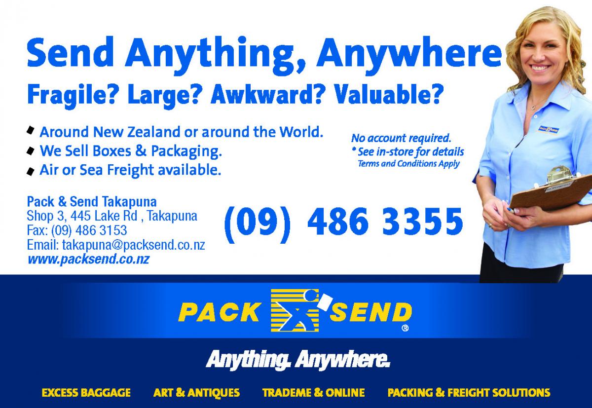 PACK & SEND Takapuna open Mon – Sat, located at 445 Lake Road, Takapuna, with convenient parking outside. Ph 09 486-3355 or email takapuna@packsend.co.nz and let them make sending easy.