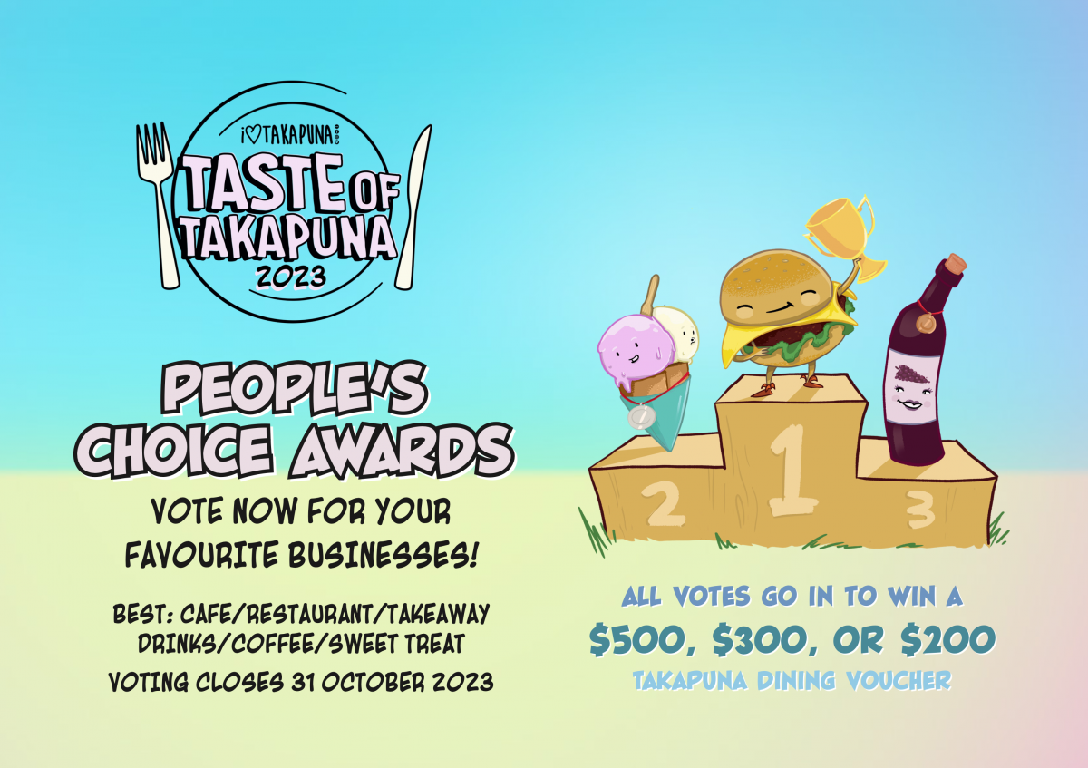 You can also VOTE NOW for your favourite local hospitality business in the third annual Taste of Takapuna Peoples’ Choice Awards! We’re giving you the ability to share the love to some of your favourite spots in Takapuna and nominate them in six different categories: Best Café, Best Restaurant, Best Takeaway, Best Coffee, Best Drinks and Best Sweet Treats! It’s all up to you – let us know your go-to spots, and they could win their category! We are also giving away prizes to some lucky voters! As a thank you for showing your support and voting for your faves, we will be giving away a $500, $300 and $200 Takapuna dining voucher to three different voters – so make sure you get your votes in now! Voting closes on Tuesday 31 October.