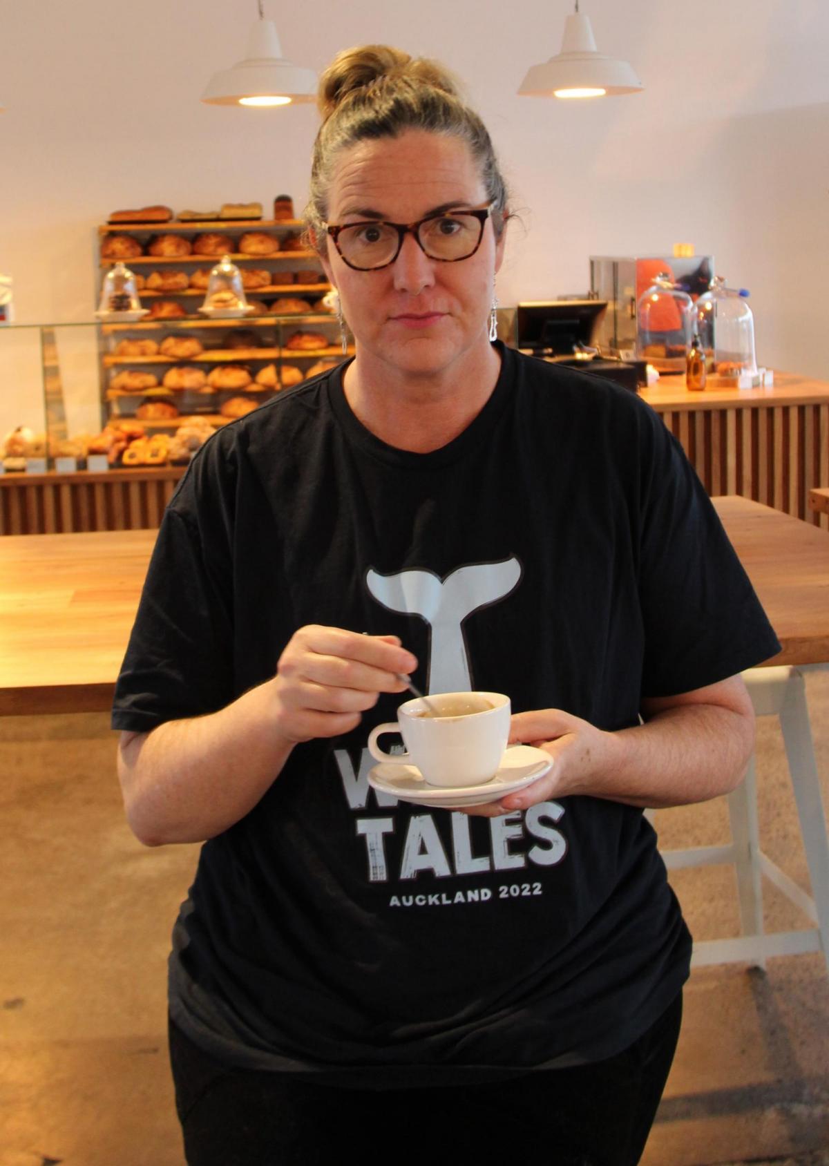 I went with Bex to get a first look at a tail painted by Takapuna artist (also massage therapist and occupational therapy student) Esther Cain. Her design was selected by Devonport’s sole (to date) sponsor, Kim Snowball of Fitzgerald-Taylor boutique stationer on King Edward Parade. Kim is renowned for her intricate shop window displays; her whale’s tail will no doubt have dramatic impact as she displays it in-store ahead of the sculpture trail and fundraising auction in January. And Devonport as a whole will benefit as the tail features in the trail near the ferry buildings, right where visitors stop to take selfies or photos of each other as they look across to the city.