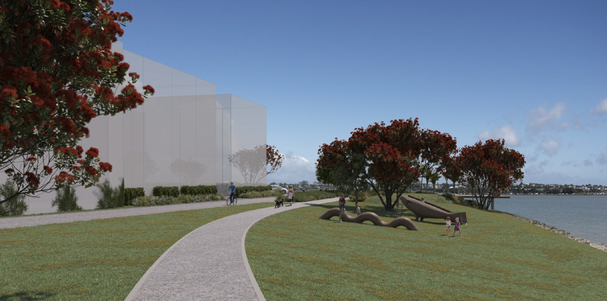 The ferry terminal is retained, but provision is made for its eventual relocation by Auckland Transport in the future to the old reclamation and wharf to the east of the property owned by Council. A new bus stop and turning area and also access for buses to and over the property is being provided. There is modern quality space provided for a better public waiting room for the ferry users. The boat ramp is retained and improved and 20 dedicated car and trailer parks are provided.