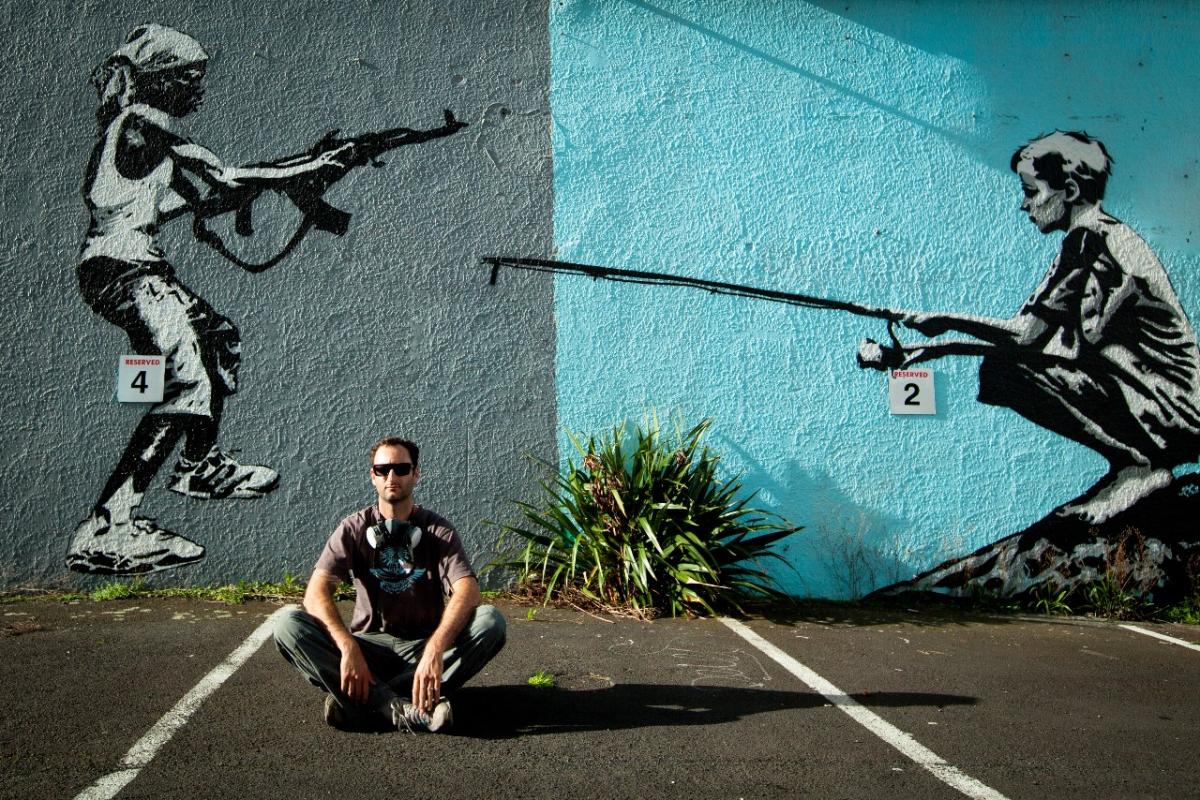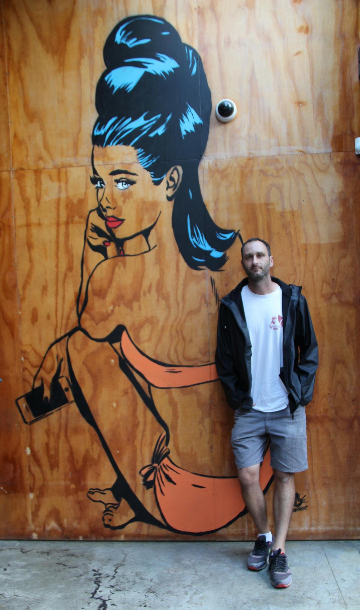 The t-shirts were mostly created for and sold at the Grey Lynn Festival – a frantic weekend of sales generating the capital to support him through the rest of the year. In the meantime, the t-shirts gave him entree to the worlds of skateboarding, hip-hop and graffiti. Already cutting stencils for his t-shirt prints, he realised he wanted to work with spray cans to create street art. But getting into a graffiti crew was “like applying to get into a gang” and no easier than breaking into the art establishment, so Sparrow went it alone, creating stencil artworks in public places. People started noticing. He began to get commissioned to create work, like the Video Easy carpark wall in Ponsonby. Big works. Others followed.