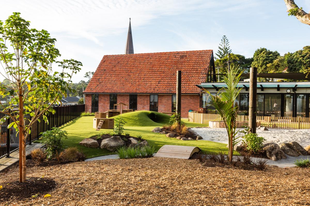 Rooms are spacious, full of light and uncluttered, opening out to the garden and outdoor play areas, while the sleeping areas are carpeted and quiet. Outside, a grand old pohutukawa provides extra shade over native plantings, playground equipment includes a pirate ship with slide, and there is a stream that is filled by the children using a self-generated hand pump.