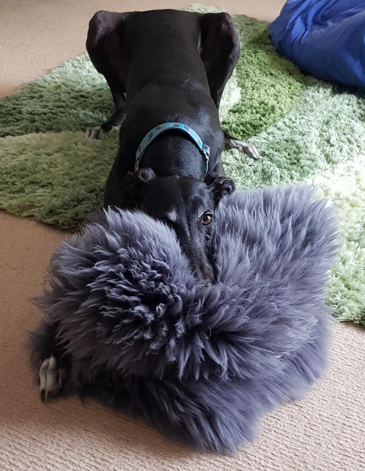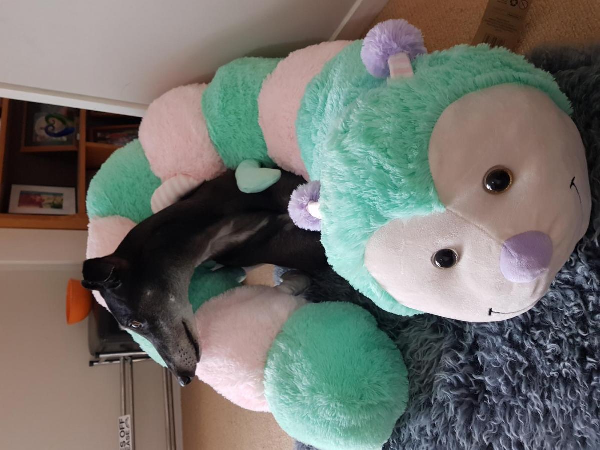 M-AS: Cuddles from people, squeaky toys, her giant 2m plush caterpillar, crunching on frozen turkey necks, and leisurely bush-walk sniffaris with her greyhound friends.