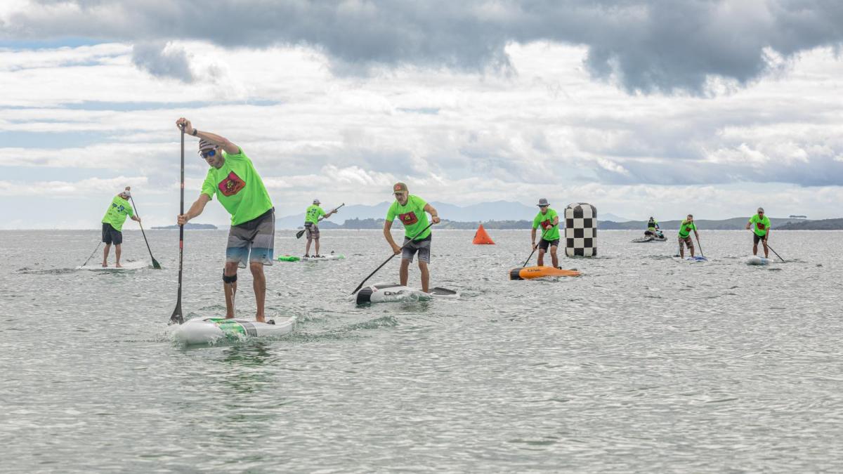 He says he “very loosely” belongs to the casual Cheltenham Paddleboard Club, which has “largely faded of late as everyone has gone wingfoiling instead”. He mostly trains, two to three times a week, from home in Bayswater and with the Takapuna SUP group at Takapuna Beach.