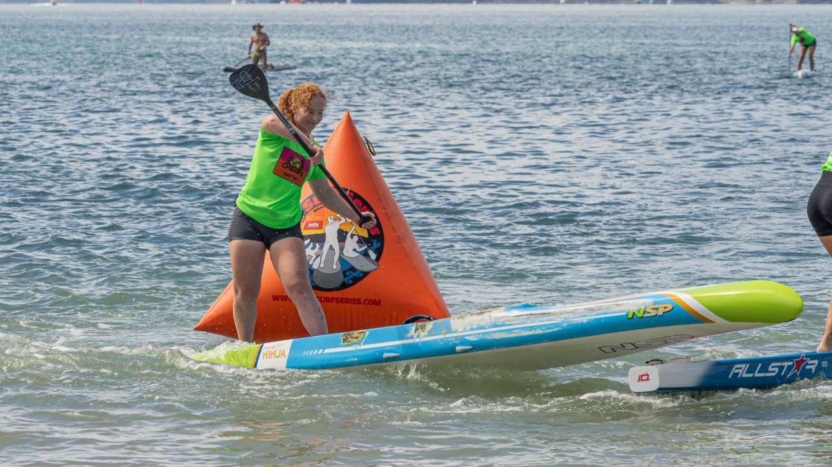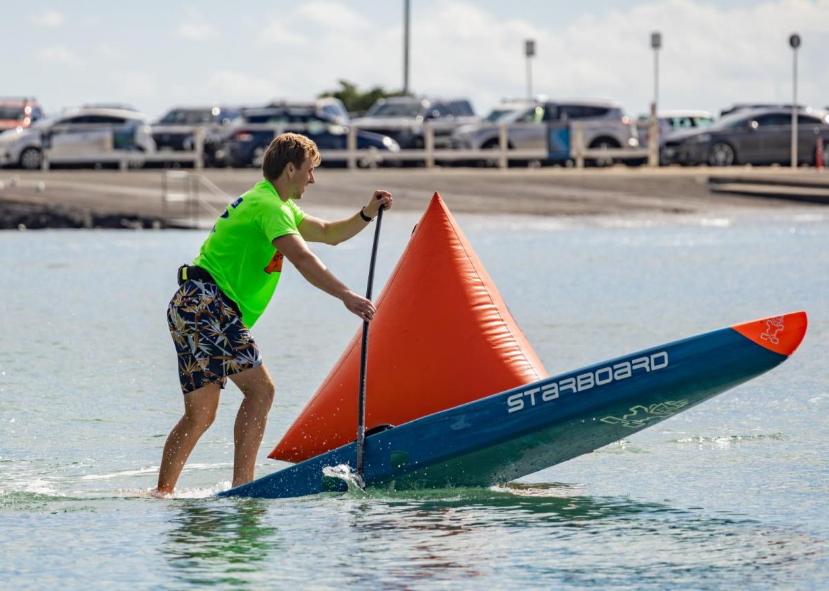 But first, a few details about the competition, which attracted 66 entries from New Zealand and overseas. To win any of the ‘overall’ titles, competitors raced in three disciplines that test the athletes’ all-round prowess. Sprint racing took place on Friday 6 March, a short, high-speed race with buoy turns. On Saturday attention turned to technical racing – a challenging 900m course, with seven buoy turns, featuring beach chicanes and a three-lap final. Sunday was devoted to distance racing.