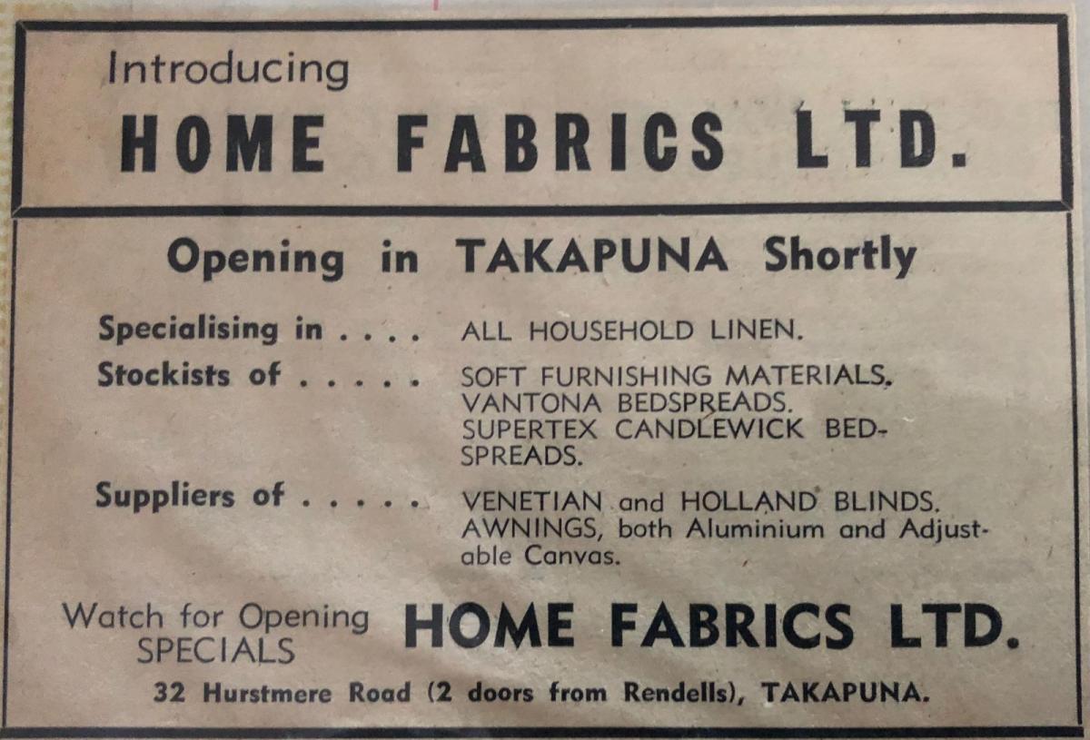 Home Fabrics – 28 Hurstmere Rd, Takapuna. Phone 486 1103.