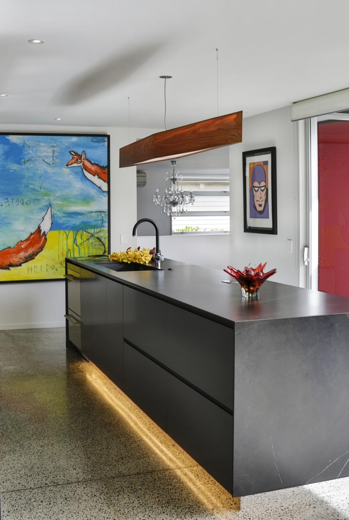 “With colour and materials, it always starts with the benchtop with me; everything else then falls into shape, either contrasting or complementing with darker or lighter cabinetry colours,” says Marianne. “With this kitchen we chose a rich, veined porcelain material and continued the darker theme by selecting a matching cabinetry colour. As a contrast, the colour of the cabinetry at the dining end of the space, which we also designed, was matched to the wall colour, to help it blend in.”