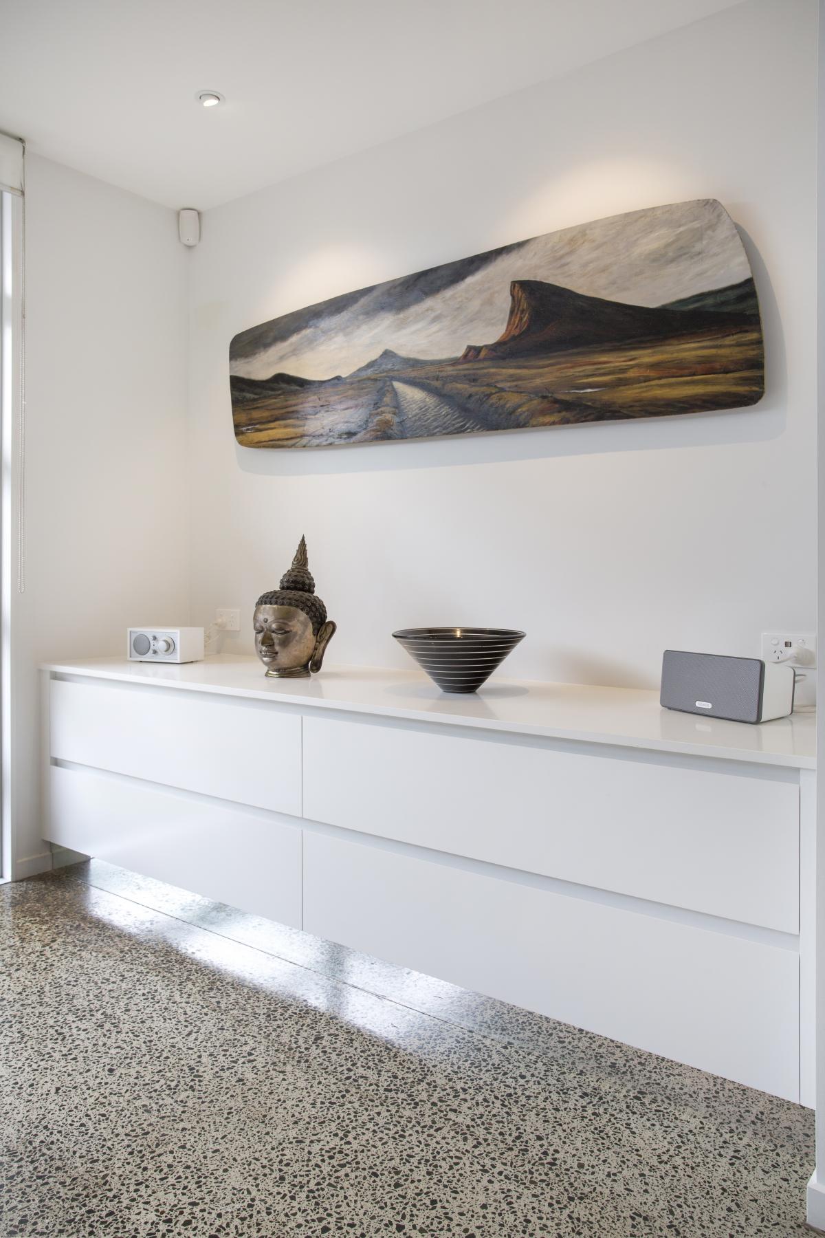 Among the list of space-saving and technical solutions the designer introduced is a downdraft extractor, mounted behind the cooktop on the benchtop, which is a lot more efficient than the overhead variety. Next to it, there’s an on-bench pull-out pantry, plus an all-in-one tap on the kitchen island that provides boiling and filtered drinking water as well as your normal hot and cold water. There’s also a handy pop-up power point on the benchtop for small appliances.