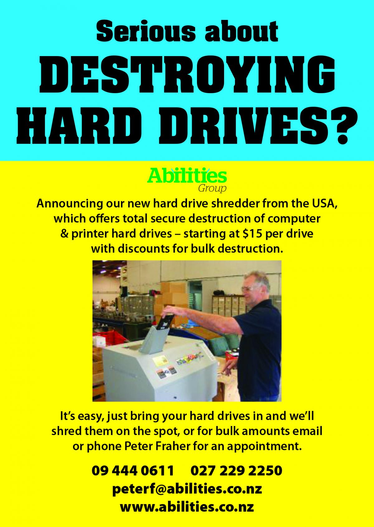 Abilities Group carries out secure destruction of documents, computer, laptop and printer hard drives, data back-up tapes, rejected and/or obsolete products, and more.