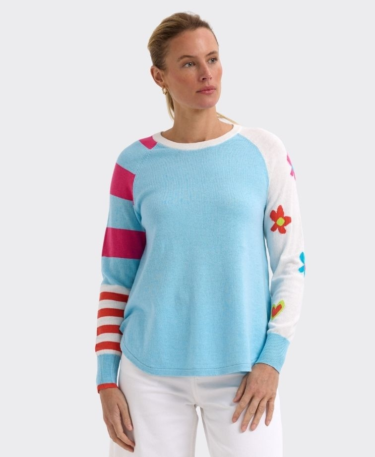 My Happy Jumper will brighten up your day. Featuring contrasting sleeves, one with flowers and a heart and the other with stripes.