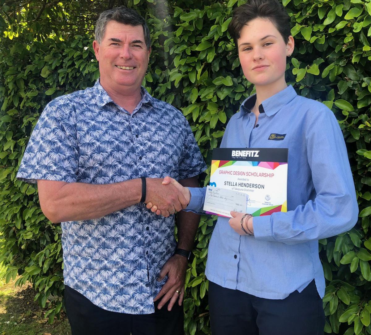 Stella Henderson was the Takapuna Grammar recipient of a Benefitz Design Scholarship in 2018. She is pictured receiving her certificate from Robert Johnson of Benefitz.