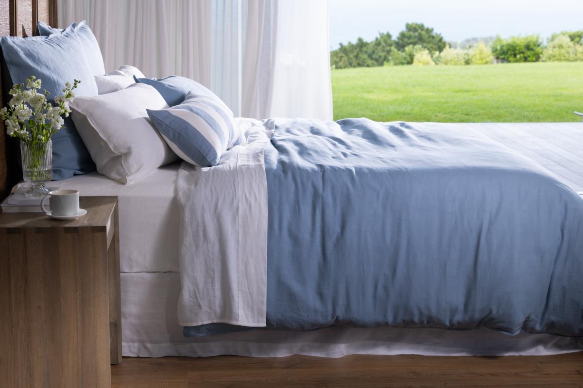Damian Dobb: Our upcoming summer drops feature plenty of nods to the beach, too. Blues, greens and fresh whites. We’ve got a blue European linen duvet called Coast, palm tree motifs across bedding and sleepwear, and one of my personal favourites, a duvet called Tidal that features bold, classic blue stripes.