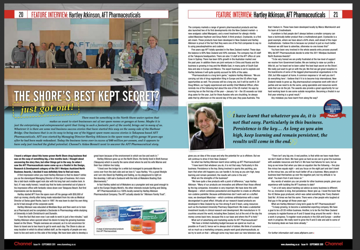 Some years before I put together the AFT Pharmaceuticals feature in 2011, I’d heard a whisper about this home-grown North Shore drug business that was on to something big. I thought about uncovering the story then, but other things got in the way. So, when I saw the AFT Pharmaceutical name come up as a finalist in the Design, Research and Development category of the 2011 Auckland North Business Awards, I decided it was time to find out more. I loved doing it.