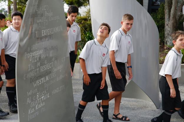 The sculpture features 86 hand-painted words such as Integrity, Humility, Courage, Opportunity, Teamwork, Kia Kaha and Whanau. Students from each class nominated words for the sculpture and these were combined with words chosen by major donors that represented their personal experiences of their school. Symbolically, the words are not visible upon entering the Archway but are clear as students depart the school for the last time, by which time all the words will hold personal meaning for each of the Westlake Boys graduates.